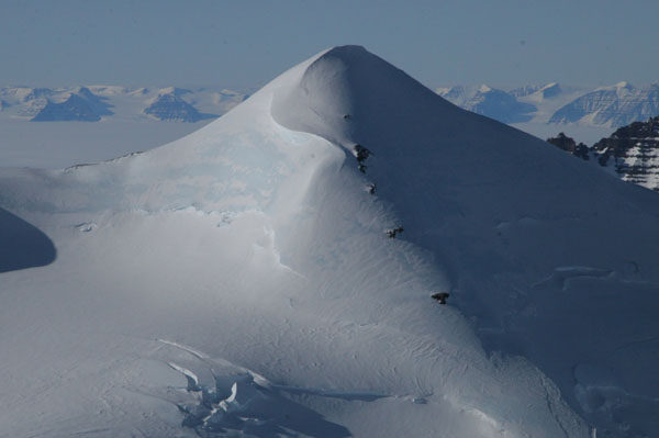 Dome (Qaqqaaq Johnson), 3683m Watkins Mountains, N68:50.4 W029:55.4 Second-highest in Greenland First ascent 1988: I. Olsson Our ascent: 04.05.2008 Route: Crossing via E ridge (PD-) Ski descent W ridge und S flank |