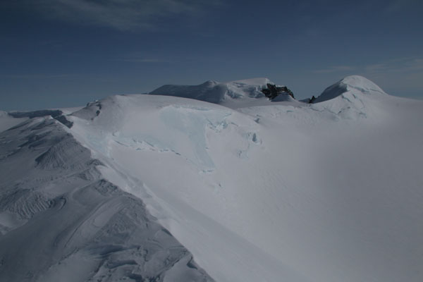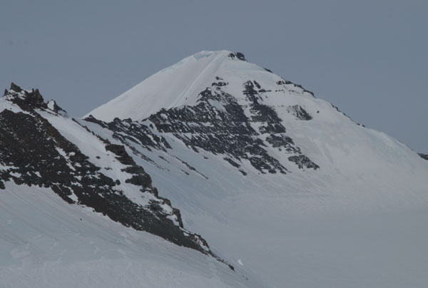 PEV (Paul-Emile-Victor, Mound), 3609m Watkins Mountains, N68:48.6 W029:33.1 Fourth-highest in Greenland First Ascent 1988: J. Lowther (unconfirmed) Second Ascent 1996: P. Grossman Our ascent: 01.05.2008 (6th ascent in history) Route: first via Deception Dome (PD+) und Jubilation Ridge (D-) First Ascent through der W flank (AD-),Ski descent W flank |